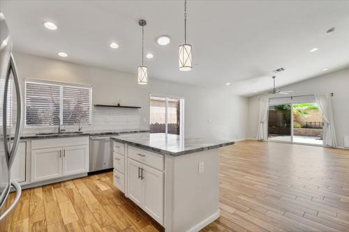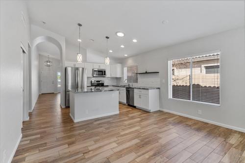 Welcome to Arrowhead Lakes, the premier lake community in Arrowhead Ranch nestled into the foothills! This updated 3-bedroom, 2-bathroom home features an inviting open floor plan and wood-like tile throughout the main living areas. Step inside to the light-filled living and dining room, where large windows bring in natural sunshine and create a welcoming space for gathering. The upgraded kitchen offers modern finishes and flows seamlessly into the family room, making it perfect for everyday living and entertaining. The primary suite includes its own private exit to the backyard, along with a beautifully updated bathroom featuring a walk-in shower and soaking tub. Two additional bedrooms and a full bathroom provide plenty of space for family, guests, or a home office.