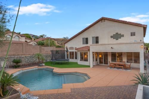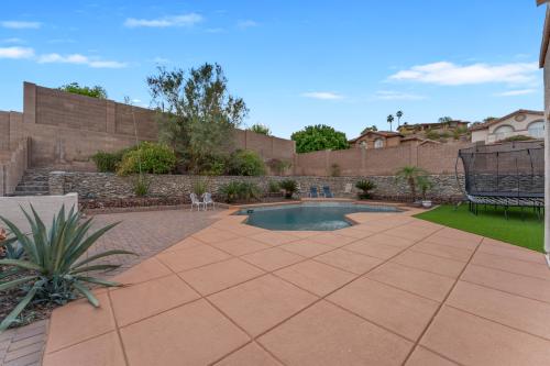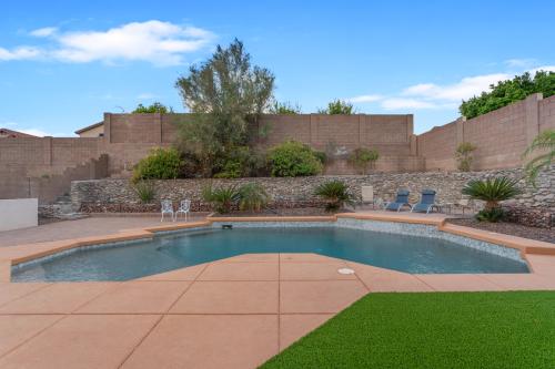 Stunning home nestled in the Ahwatukee Foothills surrounded by beautiful mountain views and steps away from the Desert Foothills Community Park. This corner lot home features 5 bedrooms / 4.5 bathrooms (3 en-suite) / 3,580 sf / 9,135 sf lot. Fully owned solar with huge electricity savings & (2) newer A/C units. Step into luxury as you are greeted by sky high vaulted ceilings, a formal living & dining room, solid surface floors, plantation shutters & upgraded windows on the North & West sides of the home. The kitchen was fully remodeled in 2021 w/ the low soffits removed, shaker-style cabinets added (to the ceiling), custom crown moulding, large island w/ breakfast bar, granite countertops, glass cooktop w/ vented hood installed, wall microwave / oven, wine fridge & more. The eat-in dining room & open family room have beautiful views of the backyard. This space stays light & bright throughout the day with the many windows. One bedroom is located downstairs w/ an en-suite bathroom; perfect for guests or someone needing their own space. The den/office is also conveniently located downstairs w/ double doors & close to the entry. The spacious primary bedroom has high ceilings and is perfect for any furniture arrangement. The attached bathroom has a separate jetted tub / shower, privacy glass block for added natural light, walk-in closet & private toilet room. One additional guest bedroom upstairs has an en-suite bathroom as well. The backyard is your own private oasis w/ various hardscape surfaces, river-rock planter walls, caged river-rock adding an extra level of detail & newly installed artificial grass. The play-pool is ready for the hot summer w/ the large baja shelf, sheer water feature, elevated seating pad & a tall rear block wall for extra privacy. Top rated schools and easy freeway access make this home hard to pass up.
