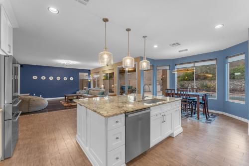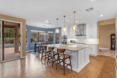Stunning home nestled in the Ahwatukee Foothills surrounded by beautiful mountain views and steps away from the Desert Foothills Community Park. This corner lot home features 5 bedrooms / 4.5 bathrooms (3 en-suite) / 3,580 sf / 9,135 sf lot. Fully owned solar with huge electricity savings & (2) newer A/C units. Step into luxury as you are greeted by sky high vaulted ceilings, a formal living & dining room, solid surface floors, plantation shutters & upgraded windows on the North & West sides of the home. The kitchen was fully remodeled in 2021 w/ the low soffits removed, shaker-style cabinets added (to the ceiling), custom crown moulding, large island w/ breakfast bar, granite countertops, glass cooktop w/ vented hood installed, wall microwave / oven, wine fridge & more. The eat-in dining room & open family room have beautiful views of the backyard. This space stays light & bright throughout the day with the many windows. One bedroom is located downstairs w/ an en-suite bathroom; perfect for guests or someone needing their own space. The den/office is also conveniently located downstairs w/ double doors & close to the entry. The spacious primary bedroom has high ceilings and is perfect for any furniture arrangement. The attached bathroom has a separate jetted tub / shower, privacy glass block for added natural light, walk-in closet & private toilet room. One additional guest bedroom upstairs has an en-suite bathroom as well. The backyard is your own private oasis w/ various hardscape surfaces, river-rock planter walls, caged river-rock adding an extra level of detail & newly installed artificial grass. The play-pool is ready for the hot summer w/ the large baja shelf, sheer water feature, elevated seating pad & a tall rear block wall for extra privacy. Top rated schools and easy freeway access make this home hard to pass up.
