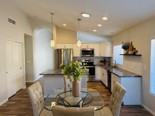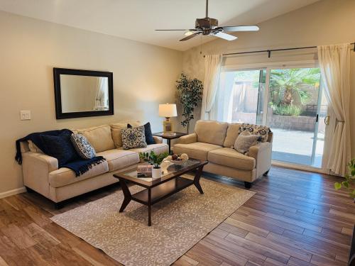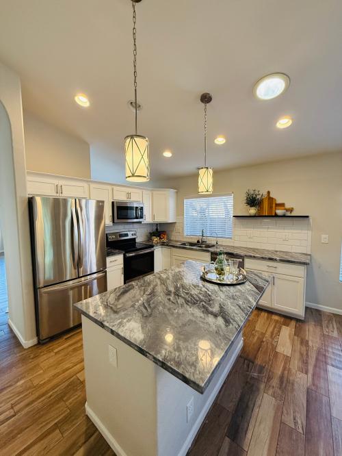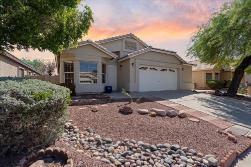 Welcome to Arrowhead Lakes, the premier lake community in Arrowhead Ranch nestled into the foothills! This updated 3-bedroom, 2-bathroom home features an inviting open floor plan and wood-like tile throughout the main living areas. Step inside to the light-filled living and dining room, where large windows bring in natural sunshine and create a welcoming space for gathering. The upgraded kitchen offers modern finishes and flows seamlessly into the family room, making it perfect for everyday living and entertaining. The primary suite includes its own private exit to the backyard, along with a beautifully updated bathroom featuring a walk-in shower and soaking tub. Two additional bedrooms and a full bathroom provide plenty of space for family, guests, or a home office.