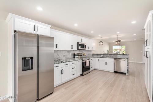 Become the proud owner of this thoughtfully REBUILT 3-bedroom home! You're welcomed by a 2-car garage, stylish pavers, and an inviting front patio. Discover a delightfully upgraded interior showcasing a serene living room with high ceilings, recessed lighting, a soothing palette, and attractive wood-look flooring. You'll also find a dedicated family room for relaxing evenings with loved ones. The updated kitchen boasts granite counters, white shaker cabinets with crown molding, a striking tile backsplash, SS appliances, chic pendant lighting, a pantry, and a two-tier peninsula with a breakfast bar. You'll also find a cozy den ideal for an office or a study.