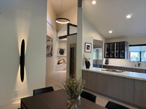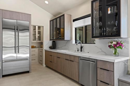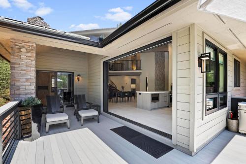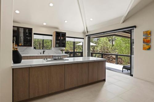Over $500,000. spent on upgrades and remodel. Sellers may carry. A striking blend of contemporary design and natural serenity located in the prestigious Rim Club. This home has been completely redesigned from the inside out with every cabinet, plumbing fixture and flooring replaced/upgraded. You will notice that every electrical outlet, light switch & light fixture has been replaced. The home was completely stripped and rebuilt with a vision! This home will wow you with the modern details present in every room and finishes you won't find in most homes in The Rim. Surrounded by native trees and granite boulders, the 2,935 sq ft residence features 3 bedrooms, 4 baths, an elevator, and seamless indoor-outdoor flow--with a private deck or patio off every bedroom. Every bedroom has its own private ensuite. As you approach the custom metal and glass pivot front door, your eyes are drawn to the Lyman Whitaker Ponderosa Copper kinetic wind sculpture gently turning in the breeze--a glimpse of the artistic touches woven throughout the home. Inside, clean lines, soaring ceilings, and walls of windows frame the tranquil landscape, while curated finishes reflect a gallery-like aesthetic. Geometric details, statement lighting, and a sculptural staircase define the open living space. Enjoy the sleek 50' electric fireplace set into the gray stone wall, echoed by an 18-foot stone feature wall in the foyer for striking continuity. The reimagined kitchen and baths showcase custom cabinetry, quartz surfaces, and premium fixtures. Both the primary and master bedroom decks have been rebuilt, and upgrades such as California Closets installations, smart systems, full mechanical updates, and a private elevator offer comfort and quality throughout. The oversized 23' x 23' garage has been fully refinished with a high-performance polyaspartic floor coating by Guardian Garage Floors, freshly painted, and outfitted with custom cabinetry and a built-in workbench-blending durability with design. Tucked across the golf course from the clubhouse with full access to the amenities available at the Mountain Spa & Fitness Center, The Trailhead, and the clubhouses at The Rim and Chaparral Pines.