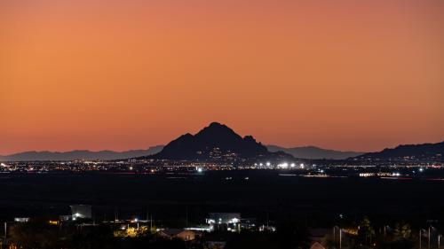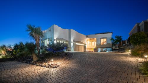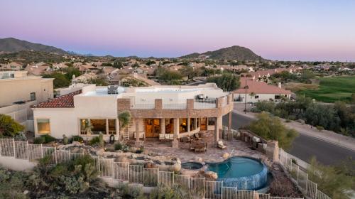 Million-dollar views and timeless Santa Fe architecture define this truly stunning, one-of-a-kind custom home, perfectly perched on an elevated corner lot in the prestigious Red Mountain Ranch golf course community. An expansive paved driveway leads to an impressive stone entry. The moment you enter, dramatic, unobstructed panoramic views command your attention, framed by a striking curved wall of windows that perfectly showcases the majestic mountains, twinkling city lights, and breathtaking Arizona sunsets. This architecturally stunning residence is truly rare, offering spectacular views from every window. Soaring 14-foot ceilings, travertine flooring, electric blinds, custom drapery, coffered ceilings, graceful arches, and stone accents come together to create refined, elegant living. The expansive great room showcases a dramatic curved stone fireplace with custom niches and offers a generous space for entertaining, and even a grand piano. The kitchen features beautiful Alder cabinetry, stainless steel appliances, a center island with sit-up breakfast bar, and seamlessly flows to the breakfast nook, great room, and formal dining room, ideal for both everyday living and hosting gatherings. Offering 3,502 sq ft, this thoughtfully designed home includes 3 bedrooms, 3 baths, plus a private office with a Murphy bed and its own entrance, perfect as a fourth bedroom. A large second sitting room/bonus room, that can easily convert to a fifth bedroom. One bedroom is thoughtfully situated in its own private wing, making it ideal for a guest suite or multigenerational living. The primary retreat is a true sanctuary, featuring expansive windows that frame stunning views. The spa-inspired primary bathroom offers dual vanities, a walk-in shower, a corner jetted soaking tub, and a spacious walk-in closet. Step outside to an entertainer's dream backyard, where even more breathtaking views await. Featuring a 45-foot covered patio, a stunning negative-edge pool and spa with cascading water features, and an outdoor kitchen complete with a stone fireplace. A spiral staircase leads to an expansive deck with spacious seating areas and breathtaking 360-degree views, stretching from the golf course and surrounding mountains to sparkling city lights and unforgettable desert sunsets. This is true desert luxury living in a Santa-Fe style masterpiece, offering some of the most spectacular views in the Valley. Red Mountain Ranch offers an array of amenities, including an 18-hole Championship Golf Course, Restaurant, Tennis Courts and a new Gated Park with Pickleball Courts, Pool/Spa, and Fitness Center with an optional membership fee. Conveniently located just minutes from the Tonto National Forrest with some of the best Hiking and Biking Trails and just 15 minutes to Saguaro Lake and the Salt River, 20 minutes to Sky Harbor and Williams Gateway Airports, Scottsdale, and close to Shops, Restaurants.